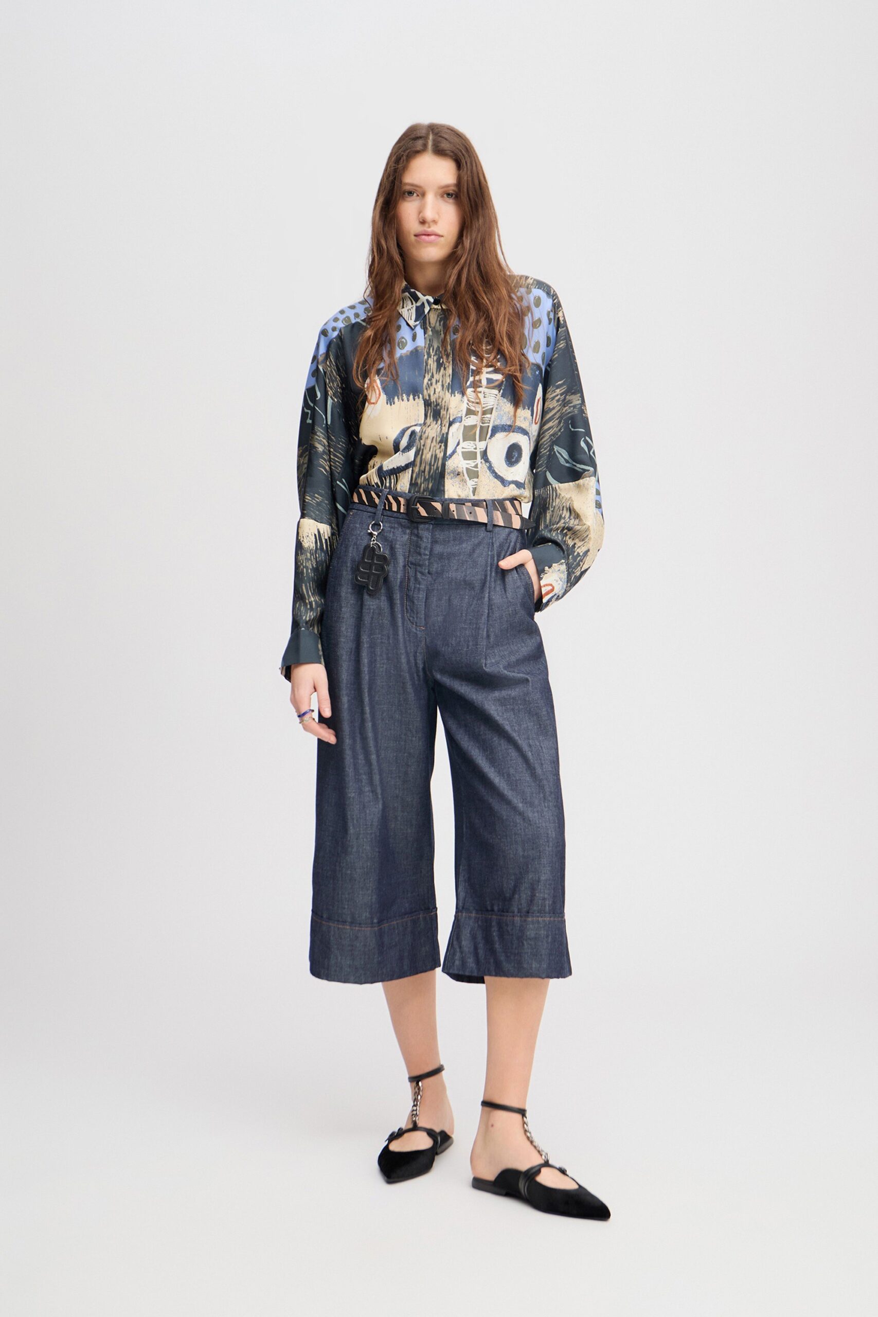 Eleganter denim culotte bukser med brede ben og opsmøg, der skaber en feminin silhuet. Lavet i 100% bomuld til maksimal komfort og holdbarhed, med praktiske bæltestropper og sidelommer.